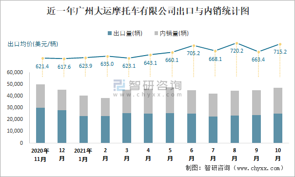 近一年廣州大運摩托車有限公司出口與內銷統計圖