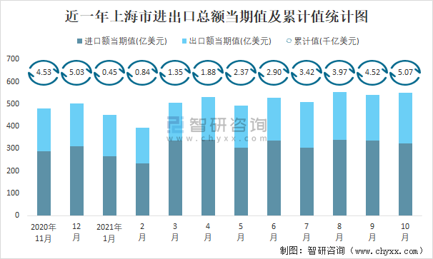 2021年1-10月上海市進出口總額為5.07千億美元,累計同比增長25%
