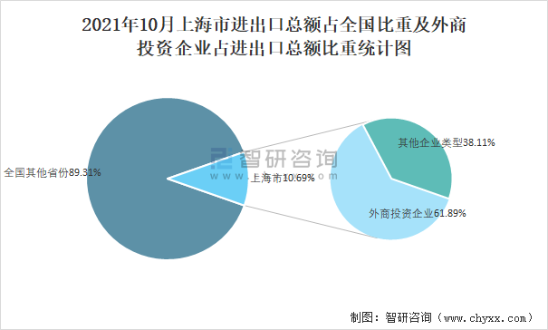 2021年10月上海市進出口總額占全國比重及外商投資企業(yè)占進出口總額比重統(tǒng)計圖