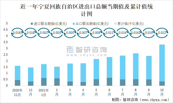近一年寧夏回族自治區進出口總額當期值及累計值統計圖