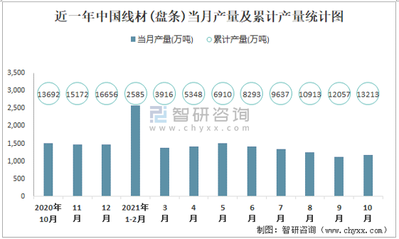 近一年中國線材(盤條)當月產(chǎn)量及累計產(chǎn)量統(tǒng)計圖