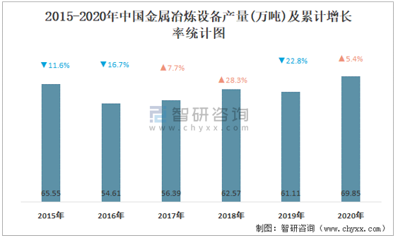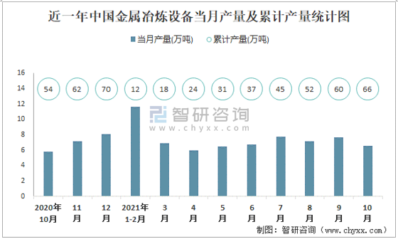 根據國家統計局數據顯示:2021年10月中國金屬冶煉設備產量為6.6萬噸,同比增長8.9%;2021年1-10月中國金屬冶煉設備累計產量為65.9萬噸,累計增長18.4%;2015-2020年中國金屬冶煉設備產量近兩年呈上升趨勢。