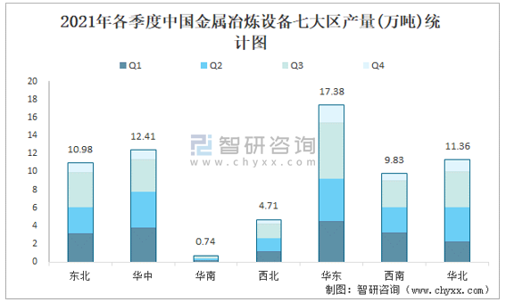 2021年各季度中國金屬冶煉設備七大區產量統計圖