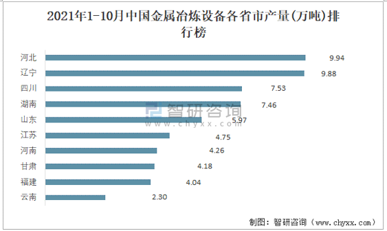 根據國家統計局數據顯示:2021年各季度(第四季度暫只統計10月數據)中國金屬冶煉設備主要集中在華東、華中、華北地區生產;2021年1-10月中國金屬冶煉設備產量大區分布不均衡,其中華東地區產量最高,特別是山東省貢獻了最多產量;2021年1-10月中國金屬冶煉設備各省市產量呈現梯隊式分布,河北、遼寧兩省產量相差不大。