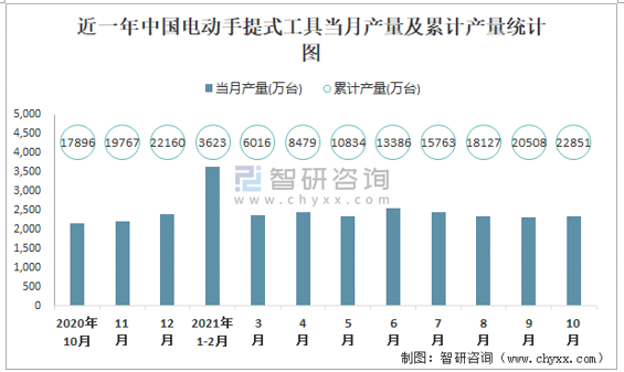 近一年中國電動手提式工具當月產量及累計產量統計圖