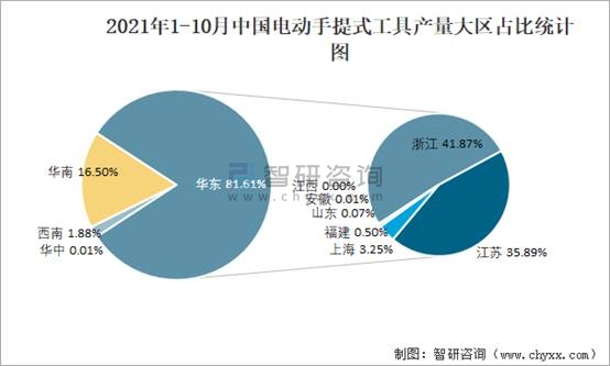 根據國家統計局數據顯示:2021年各季度(第四季度暫只統計10月數據)中國電動手提式工具主要集中在華東、華南、西南地區生產;2021年1-10月中國電動手提式工具產量大區分布不均衡,其中華東地區產量最高,特別是浙江省貢獻了最多產量;2021年1-10月中國電動手提式工具浙江、江蘇兩省產量遠超于其他省份。