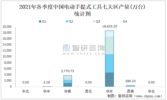 2021年各季度中國電動手提式工具七大區產量統計圖