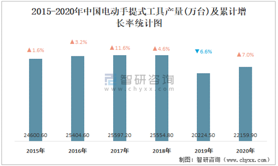 2015-2020年中國電動手提式工具產量及累計增長率統計圖