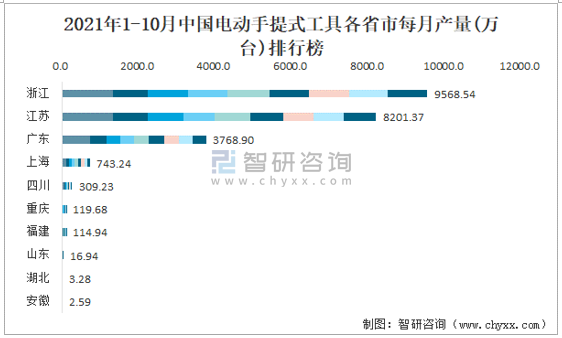 2021年1-10月中國電動手提式工具各省市每月產量排行榜