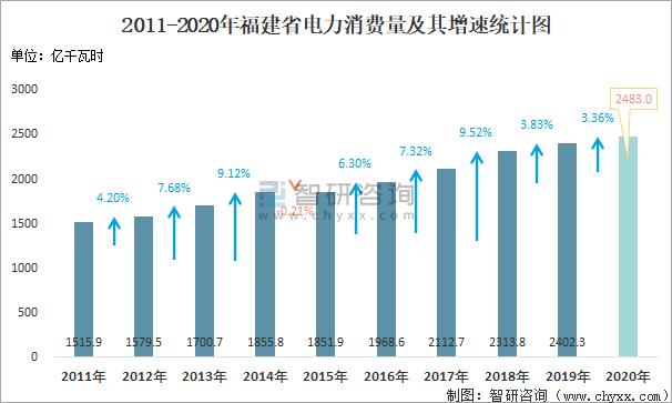 2011-2020年福建省電力消費量及其增速統計圖