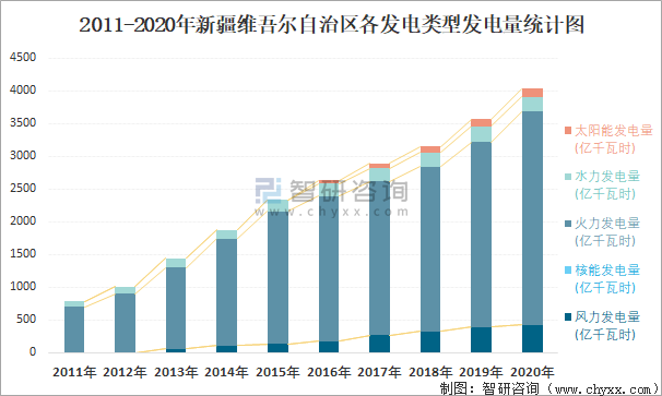 2011-2020年新疆維吾爾自治區各發電類型發電量統計圖