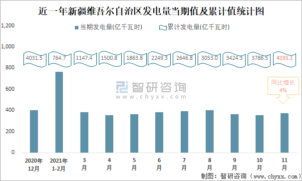 近一年新疆維吾爾自治區發電量當期值及累計值統計圖
