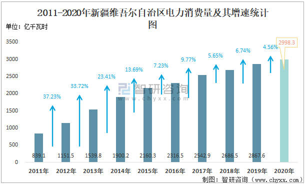 2011-2020年新疆維吾爾自治區電力消費量及其增速統計圖