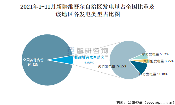 2021年1-11月新疆維吾爾自治區發電量占全國比重及該地區各發電類型占比圖
