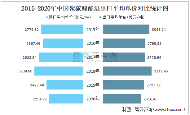 2015-2020年中國聚碳酸酯進出口平均單價對比統計圖