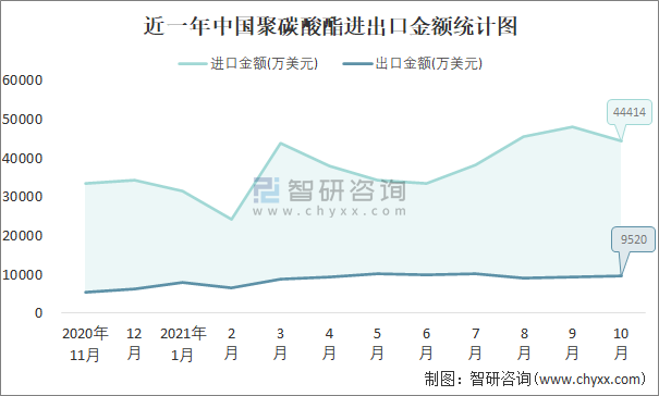 近一年中國聚碳酸酯進出口金額統計圖