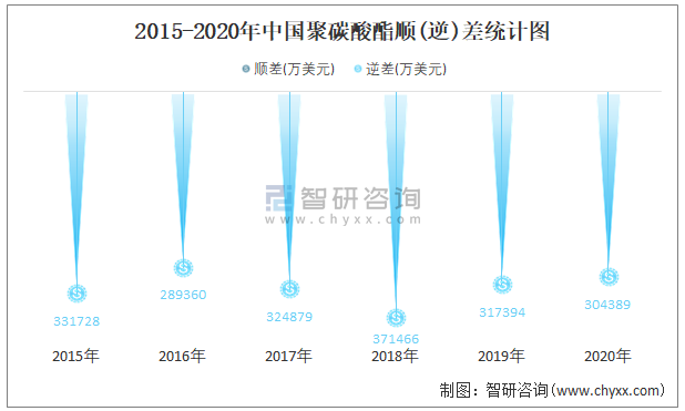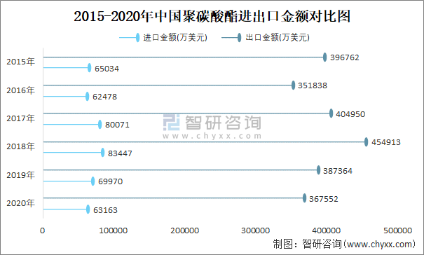 2015-2020年中國聚碳酸酯進出口金額對比統計圖
