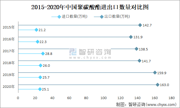 2015-2020年中國聚碳酸酯進出口數量對比統計圖