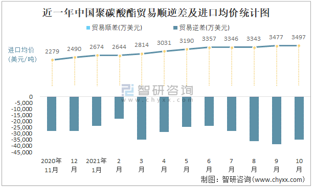近一年中國聚碳酸酯順逆差及進口均價統計圖