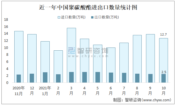 近一年中國聚碳酸酯進出口數量統計圖