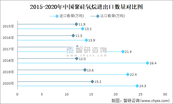 2015-2020年中國聚硅氧烷進出口數量對比統計圖