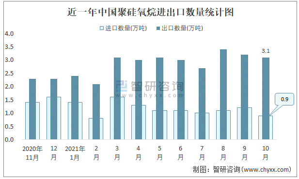 2021年10月中國聚硅氧烷進出口數量分別為0.9萬噸和3.1萬噸
