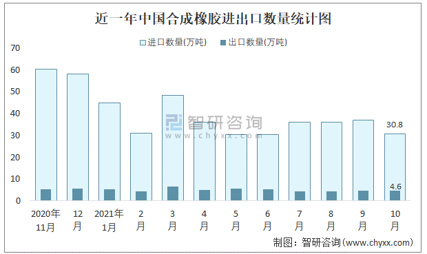 2021年10月中國合成橡膠進(jìn)出口數(shù)量分別為30.8萬噸和4.6萬噸