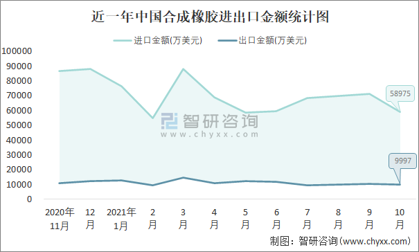 近一年中國合成橡膠進(jìn)出口金額統(tǒng)計圖