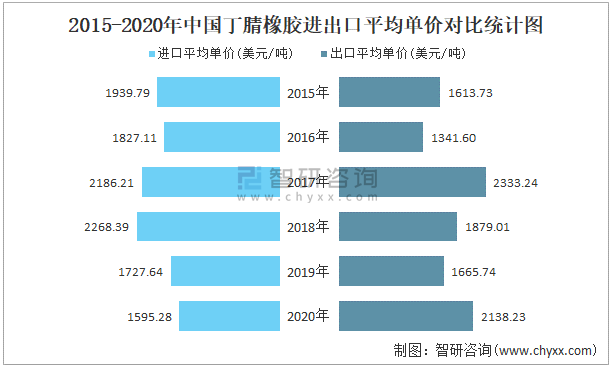 2015-2020年中國丁腈橡膠進出口平均單價對比統計圖