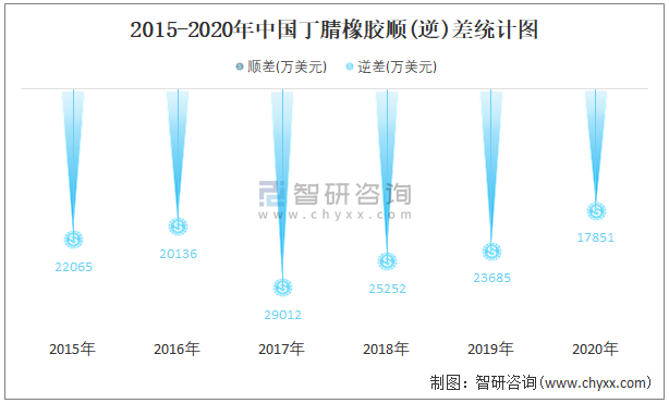 2015-2020年中國丁腈橡膠順(逆)差統計圖