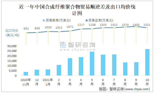 根據中國石油和化學工業聯合會數據顯示:2021年10月中國合成纖維聚合物進口數量為9.5萬噸,出口數量為40萬噸;進口金額為26079萬美元,出口金額為52857萬美元;近一年中國合成纖維聚合物出口總金額大于進口總金額,貿易順差為主,出口均價1321美元/噸。