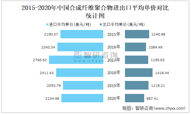 2015-2020年中國合成纖維聚合物進出口平均單價對比統計圖
