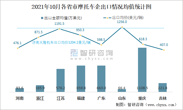 2021年10月各省市摩托車企出口情況均值統計圖
