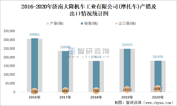 2016-2020年濟南大隆機車工業有限公司產銷及出口情況統計圖