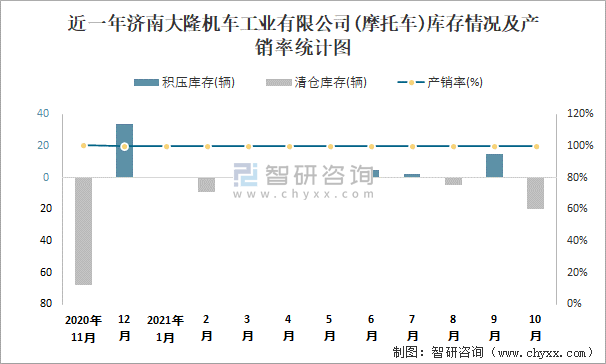 近一年濟南大隆機車工業有限公司庫存情況及產銷率統計圖