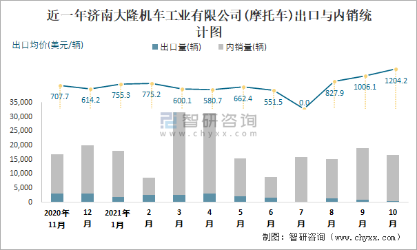 根據中國汽車工業(摩托車)產銷快訊數據統計可知:近一年濟南大隆機車工業有限公司(摩托車)共清倉庫存36輛,其產銷率存在一定幅度波動,2020年11月產銷率最高(100.41%),清倉庫存68輛,2020年12月產銷率偏低(99.83%),積壓庫存34輛;近一年濟南大隆機車工業有限公司(摩托車)出口量偏少,銷量以內銷為主,總出口量占比總銷量的10.1%,出口均價近3個月呈現遞增趨勢,其中10月出口量為337輛,出口均價約為1204.15美元/輛;2021年1-10月濟南大隆機車工業有限公司(摩托車)累計出口量為15870輛,同比增長28.12%,累計出口金額約為1109.37萬美元,同比增長24.99%。