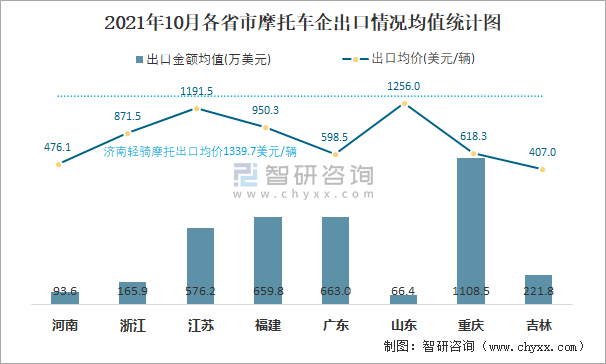 2021年10月各省市摩托車企出口情況均值統(tǒng)計圖