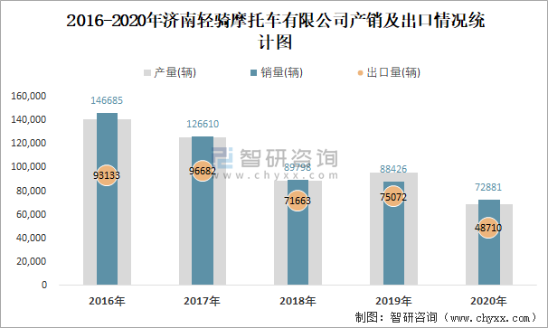 2016-2020年濟南輕騎摩托車有限公司產(chǎn)銷及出口情況統(tǒng)計圖