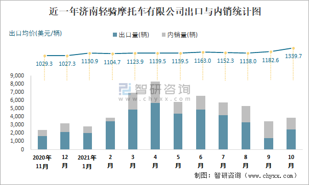 近一年濟南輕騎摩托車有限公司出口與內(nèi)銷統(tǒng)計圖