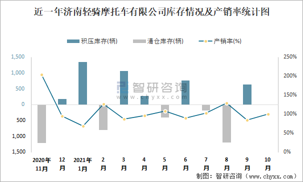 近一年濟南輕騎摩托車有限公司庫存情況及產(chǎn)銷率統(tǒng)計圖