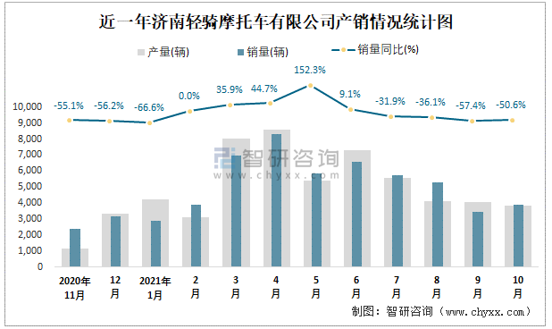 近一年濟南輕騎摩托車有限公司產(chǎn)銷情況統(tǒng)計圖