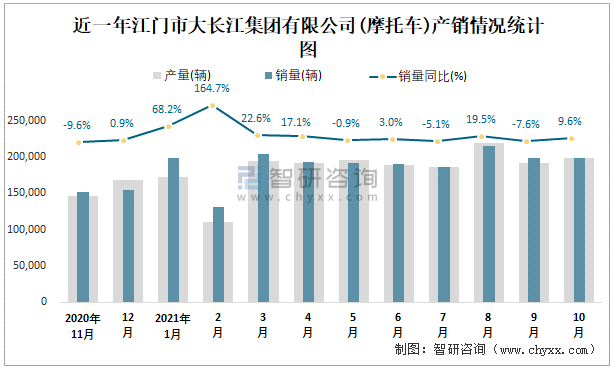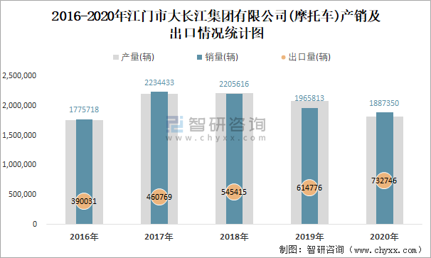 根據中國汽車工業(摩托車)產銷快訊數據顯示:2021年10月江門市大長江集團有限公司(摩托車)產量為198461輛,同比增長21.98%,銷量為199374輛,同比增長9.58%;2021年1-10月江門市大長江集團有限公司(摩托車)累計產量為1850031輛,同比增長23.31%,累計銷量為1908885輛,同比增長20.7%;2016-2020年江門市大長江集團有限公司(摩托車)銷量2017年達到最高值,此后逐年遞減,且近5年總產量大于總銷量,積壓了庫存4683輛,出口量偏少,銷量以內銷為主。