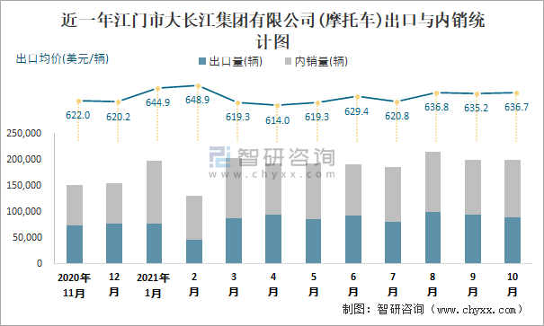 根據中國汽車工業(摩托車)產銷快訊數據統計可知:近一年江門市大長江集團有限公司(摩托車)共清倉庫存50636輛,其產銷率存在一定幅度波動,2月產銷率最高(118.65%),清倉庫存20559輛,2020年12月產銷率偏低(91.87%),積壓庫存13646輛;近一年江門市大長江集團有限公司(摩托車)銷量以內銷為主,總出口量占比總銷量的44.9%,出口均價4月跌至最低值,此后總體呈現上升趨勢,其中10月出口量為88786輛,出口均價約為636.7美元/輛;2021年1-10月江門市大長江集團有限公司(摩托車)累計出口量為844688輛,同比增長44.89%,累計出口金額約為53175.89萬美元,同比增長52.84%。