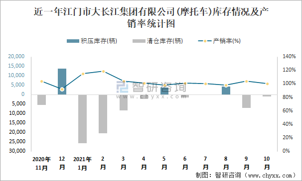 近一年江門市大長江集團有限公司庫存情況及產銷率統計圖