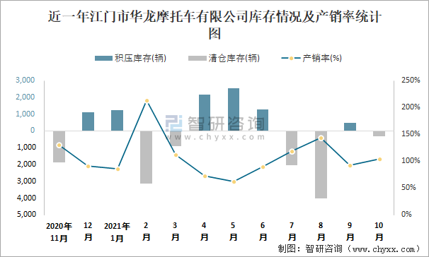 近一年江門市華龍摩托車有限公司庫存情況及產銷率統計圖