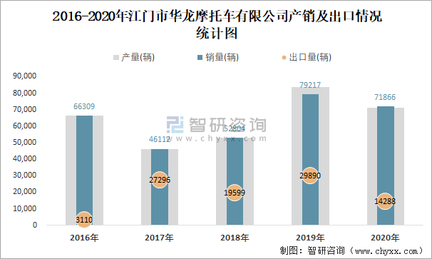 2016-2020年江門市華龍摩托車有限公司產銷及出口情況統計圖