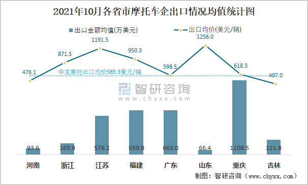 根據中國汽車工業(摩托車)產銷快訊與企查查數據統計可知:2021年10月92家車企摩托車銷量為1657429輛,出口總金額約為50967.89萬美元(其中有兩家子公司,其數據已包含在母公司中,不參加行業匯總);2021年10月92家車企擁有20年以上企業年齡的銷量最高,從企業資本性質來看,銷量占比最大的為內資企業(部分上市公司股份不明確的企業未統計在內),從企業人員規模來看,擁有1000-9999人員規模的車企銷量占比最大,非上市公司銷量占比最高。92家車企主要分布在10個省(市),其中廣東車企最多(26個),部分省市車企不出口,從出口金額均值來看,重慶車企(18家企業)出口金額均值最高,江門市華龍摩托車有限公司約為585.3美元/輛,低于廣東出口均價。