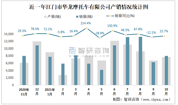近一年江門市華龍摩托車有限公司產銷情況統計圖