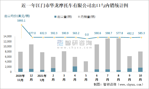 近一年江門市華龍摩托車有限公司出口與內銷統計圖