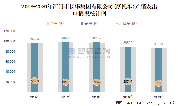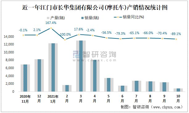 根據中國汽車工業(摩托車)產銷快訊數據顯示:2021年10月江門市長華集團有限公司(摩托車)產量為843輛,同比下降89.05%,銷量為843輛,同比下降89.05%;2021年1-10月江門市長華集團有限公司(摩托車)累計產量為48905輛,同比下降32.01%,累計銷量為48905輛,同比下降32.14%;2016-2020年江門市長華集團有限公司(摩托車)銷量2017年達到最大,此后逐年遞減,且近5年總銷量大于總產量,清倉庫存372輛,出口量偏少,銷量以內銷為主。